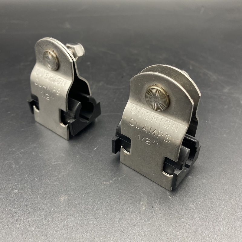 Cushion clamps are typically used in pneumatic refrigeration, HVAC, and some low pressure hydraulic lines. cushion clamps also eliminate metal to metal contact between the fluid lines and the support hardware. Standard material for the hardware is a clear trivalent zinc-plated steel, with options for both 304 and 316 grades stainless steel. Additional special options include aluminum and powder coating.