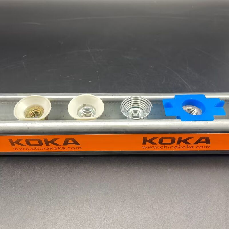 Features: Koka Strut Channel Nuts are manufactured from mild steel cold rolled coil, and after stamping and machining operations are completed, they are case hardened,assuring positive biting action into the inturned edge of the Koka strut channel.